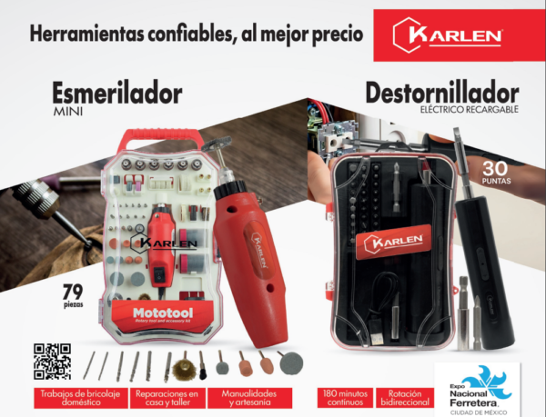 Dos ejemplos notables dentro de esta categoría son el mini esmerilador tipo mototool y el destornillador eléctrico recargable, ambos integrados en la línea de herramientas Karlen distribuida por Gimbel Mexicana, caracterizada por su enfoque en soluciones prácticas para ferreterías y técnicos en campo.