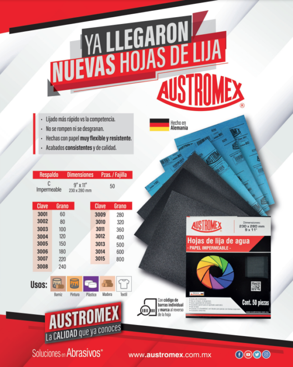 Las nuevas hojas de lija impermeables representan una opción confiable para quienes buscan rendimiento, durabilidad y acabados uniformes. Su resistencia al desgaste, la variedad de granos y su capacidad de trabajar rápido las convierten en una herramienta valiosa para talleres y profesionales que buscan mejorar cada detalle de sus proyectos. Con marcas como Austromex, que han trabajado durante años en soluciones para abrasivos, seguir puliendo y perfeccionando materiales se vuelve una tarea más eficiente y precisa.