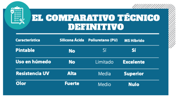 La selección entre Silicona, PU y MS Híbrido depende de sustrato, clima y movimiento estructural.
